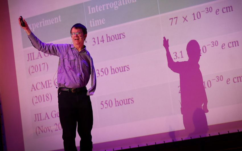 [Cornell] Sí, debo decir que esto es completamente distinto al mundo de los condensados de Bose–Einstein. Estos experimentos se realizan a temperaturas cercanas a la temperatura ambiente. El llamado momento dipolar eléctrico del electrón es —digamos— una imperfección del electrón, una asimetría del electrón; puede que ni siquiera exista. Se ha propuesto su existencia y, si realmente existe, podría ayudar a explicar preguntas fundamentales que se remontan al origen del universo.